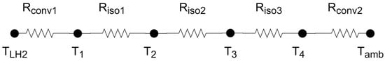 One of the main problems regarding the insulation system is the infiltration of atmospheric gases, which at the temperature of liquid hydrogen will condense or even solidify. To solve this problem, an active insulation system can be used, making it necessary to maintain a pressure of about 0.133 kPa []. However, maintaining the vacuum level necessary to ensure that the thermal properties do not degrade is difficult. It is also necessary to consider the different coefficients of thermal expansion between the walls of the tank that could jeopardize the insulation properties [].