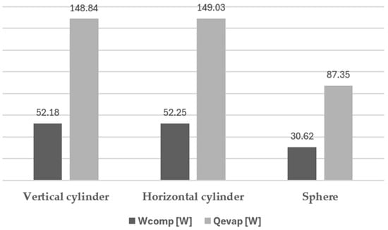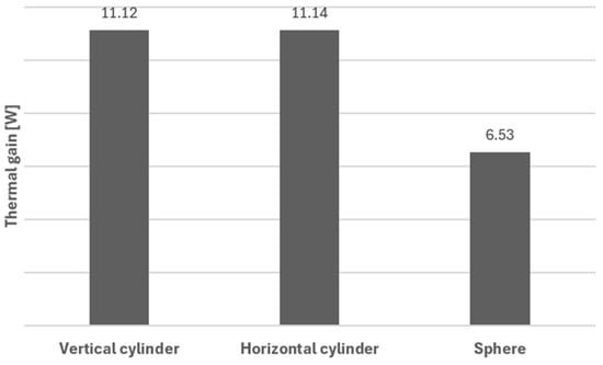 As expected, an important factor to take into consideration is the shape of the tank, as this influences heat transfer rates. A comparison of thermal gains was made between the three geometries under study: cylindrical tanks (either vertical or horizontal), with cupped bottoms, and spherical tanks. Thermal gains were calculated according to the method described in Section 3. The results of such calculations show that the spherical tank presents the lowest thermal gain value of 6.53 W; see Figure 10. This value is approximately 1.7 times lower when compared to that for a cylindrical tank arranged vertically or horizontally. This value is understandable since, for a given inner volume, the spherical surface area is the smallest, which lowers heat transfer.