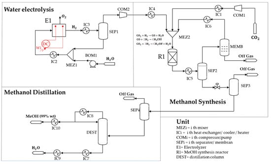Process flow diagram of a “green” methanol production by electrolysis (ALT5).
