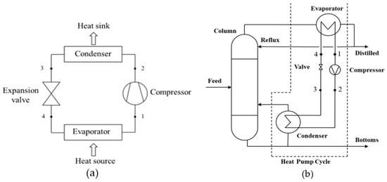 The concept of heat pumps (HPs) is based on transferring heat from a low-temperature medium to a higher-temperature medium with the help of an external energy source or work applied to a fluid in the system [,]. The system is analogous to a reverse refrigeration cycle (Figure 2), which has enormous application potential, mainly in distillation columns.
