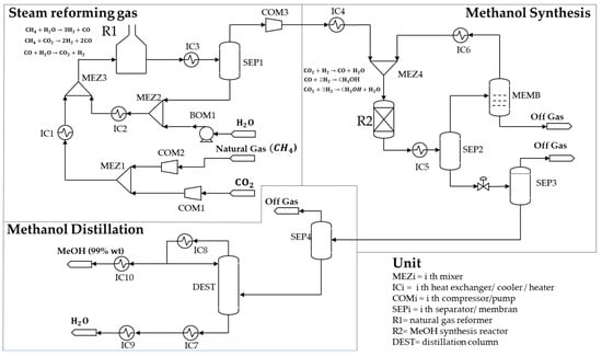 The base case (Figure 3) corresponds to a combined process (CR) scheme, where dry enters as raw material at the unit inlet together with natural gas (), where the mixed gas is preheated to later join with the superheated steam in the reforming furnace, where the main endothermic reactions (R1) occur for the production of hydrogen under a catalytic medium of nickel oxide []. The product gas is compressed (COM3) towards a reactor (R2) to obtain methanol, where after some stages of separation and condensation of liquids, the water–methanol mixture obtained is sent to a distillation column of 20 theoretical plates to obtain a methanol steam at 99.8% wt. The production base of this plant for economic calculations is 181.4 ton/day.