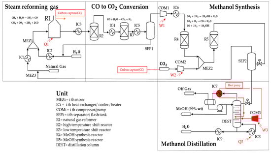 In this study, the process flow diagrams, calculations, and estimates of a conventional plant for methanol production [] were initially developed, presenting an improved technological variant compared to the commonly used SMR process in the industry. This variant, known as methane bi-reforming or combined reforming (CR) [], offers improvements in terms of carbon emission reduction and energy efficiency. The study also examines the use of heat pumps to enhance energy efficiency in industrial distillation processes, specifically in methanol production. The integration of heat pumps allows for the recovery of low-temperature heat generated during the distillation process and its transfer to areas requiring higher thermal energy. Additionally, carbon capture and utilization (CCU) technology is incorporated to reduce CO2 emissions by reusing the captured CO2 in methanol synthesis, which not only contributes to emissions reduction but also improves the sustainability of the process in terms of energy and economics. This approach strengthens the potential for methanol production in Colombia by leveraging renewable energy sources such as photovoltaic solar power, which provides the energy necessary to operate both the heat pumps and the carbon capture system.