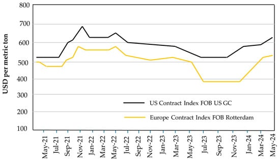 In Figure 5, the recent behavior of methanol prices in the European and American markets can be observed, where in the United States, in recent years, they have exceeded 500 USD/ton MeOH, making it a potential export market. The data presented in the figure are based on reference [].