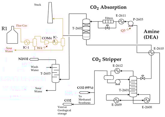 The determination of the mass and energy flows of the methanol production process (Figure 3 and Figure 5) is carried out by simulation using the commercial software HYSYS V12.1, using the thermodynamic model of Peng Robinson for an annual production base of 70,000 tons and a methanol purity of 99.8% wt, where the CAPEX of the associated equipment is obtained using the Aspen Capital Cost tool and the OPEX of the facility, from real information collected from the refinery and supplemented with data from the literature []. The reforming furnace R1 (Figure 3 and Figure 4) is simulated as a conversion reactor, the R1-R2 CO to converters are simulated by equilibrium reactors, and the R4-R5 methanol synthesis reactors are of the conversion type. The distillation column is simulated with 25 theoretical plates and a reflux ratio of 0.96. The heat pump integrated between the top and bottom of the column uses propane as a working fluid and a centrifugal compressor of 850 KW power. The carbon capture unit (CCU; Figure 6) for use of in the synthesis of methanol was simulated by a conventional T-2602 chemical absorption (20 theoretical stages) and a T-2601 stripping column (21 theoretical stages) using a DEA [] amine solution which takes the combustion gas (flue gas) from the reforming furnace. The thermodynamic model used for the simulation of the amine is Acid Gas-Chemical Solvents and Peng Robinson for the transport of the gas and .