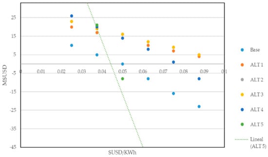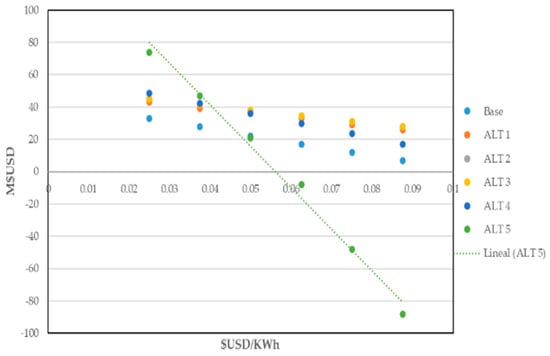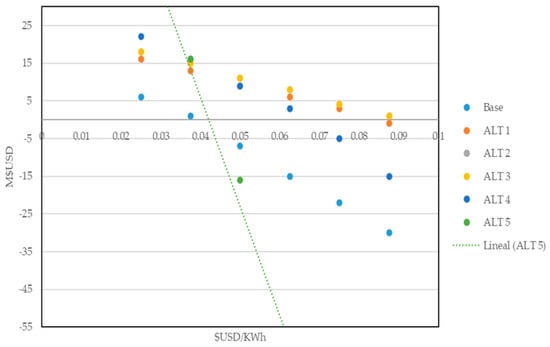 Methanol market prices are uncertain, although some local linear trends with cycle (LLTC) prediction models [] allow us to identify expected ranges between 480 and 520 USD/ton by 2050. In this analysis, values obtained for the year 2024 have been taken as a reference. In this case, for average values of USD 500/ton, it can be observed that ALT 3 (Figure 11), which implements a heat pump system coupled to the distillation column and uses photovoltaic sources, generates positive NPVs that make this alternative viable, making this an adequate implementation proposal even at electricity costs close to 0.08 USD/KWh (Appendix A).