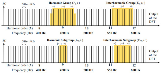 Illustration of the harmonic group of order 9, Yg,9, the interharmonic group of order 11, Yig,11, the harmonic subgroup of order 9, Ysg,9, and the centered interharmonic subgroup of order 11, Yisg,11, for the case of f1 = 50 Hz [9].