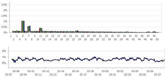 Exemplary voltage harmonic spectrum (expressed as percentage of fundamental component) in 110 kV network with a high share of wind farms and industrial devices. Voltage distortion expressed as THD (%) over time; red—phase 1, green—phase 2, and blue—phase 3.