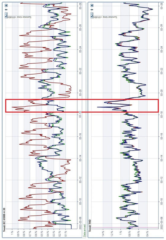 Each category requires a detailed explanation. For the sake of simplicity, one can say that the level of voltage is the most common issue. The voltage level is easy to observe using even the simplest meters and has a direct impact on devices, e.g., inverters switch off above the voltage threshold. Voltage changes have an important impact on the operation of devices, since voltage changes result in varying currents drawn by devices and therefore varying outputs, e.g., light emission [5]. Voltage asymmetry is connected to higher energy losses and faster aging, which have a particularly large impact on three-phase motors [6].