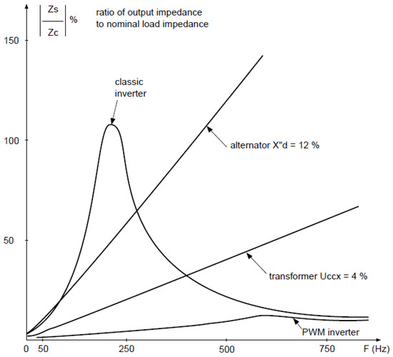 The voltage harmonic distortions can be strongly influenced by the modification of the power system structure. Figure 3 shows the fifth harmonic amplitude measured in three phases, varying over time. Based on the time of occurrence, one can indicate that distortions are higher during working days and lower during weekends; therefore, the changes are most likely caused by nearby industrial activities. The 5th harmonic, 19.03, reached 1% (marked in red), which was caused by the modification of the power system structure—a disconnection of one of two 110 kV lines, which was closer to the 220/110 station. In the presented case, the amplitudes of the harmonics have a large safety margin from the limits defined in Table 1; at the same time, the presented case shows that one needs to be very careful during the analysis of the impact of new devices on the power system, since the harmonic content may change instantaneously when the power system structure and the resulting impedance characteristic change. The impedance characteristics of exemplary power system elements are presented in Figure 4. The resulting impedance is a combination of elements’ impedances, e.g., line impedance is additional to source impedance. The PWM inverter ensures lower impedance than the conventional inverter, which ensures the minimization of harmonic distortion [32].
