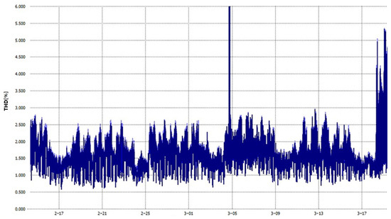 Voltage distortion expressed as THD (%) as a function of time (month–day) in 110/15 kV substation at the 15 kV side.