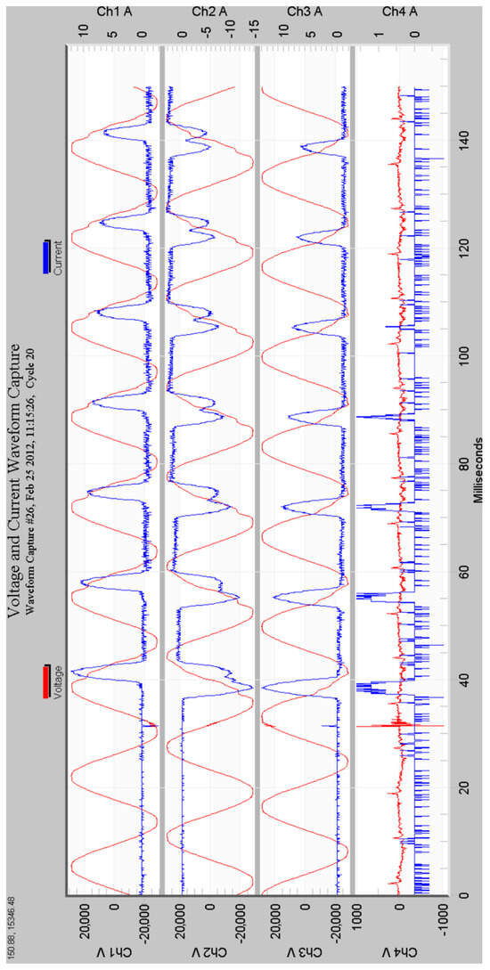 Recently, the Polish Railway (PLK, PKP) announced a green railway initiative, according to which a high share of electricity is produced using renewables [41]. The integration of renewables with railway networks is even more challenging than distribution networks because the short-circuit power is even lower, and the traction loads emit a large amount of harmonics due to passive 6- or 12-pulse rectifiers. The short-circuit power decreases with the increase in distance from the substation. Therefore, deep in the MV network, the power quality may be significantly lower, e.g., 5 km of 240 mm2 cable decreases the short circuit power from 200 MVA to 137 MVA, which is often the case for the supply of MV railway substations. As a result, the susceptibility of the network to harmonic distortions increases. The railway substation may also be supplied from the 110 kV network. In this case, the railway substation is equipped with four winding transformers: primary 110 kV, two windings for traction, and one non-traction load winding [42]. From the harmonics perspective, the best point of connection would be a 110 kV network; however, from the techno-economical perspective, the integration of a new source is justified when the power is roughly 20 MW or more. Another option for energy source connection is the non-traction load winding, typically 15 kV. Unfortunately, the non-traction load winding has very little power, in the range of 1 MVA, which results in a great reduction in the short circuit power to approximately 20–30 MVA. The final option for the integration of renewables with the railway network is connection to the DC network, which considers specific regulations and also distortions [43,44]. Harmonic analysis should also include analysis of waveforms, at least for typical transient conditions, e.g., the switching on of the inverter, particularly in locations with a high share of devices activated at similar time periods [45]. An exemplary startup of a high-power PV plant is presented in Figure 6 below (current marked in blue and resulting voltage distortions marked in red). One can see strongly distorted currents and resulting voltage distortions.