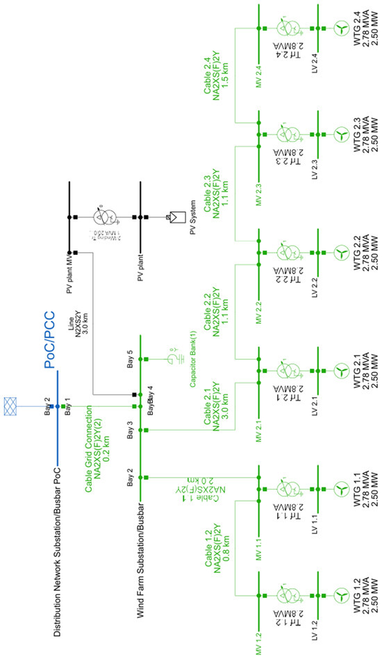 The purpose of the simulation was to draw attention to changes in the power system during system regulation or development. Attention is paid to the resonance band and its sensitivity to power system development and volt/VAR regulation. Simulations were performed using a modified test model available in the PowerFactory software 2024 SP4—wind farm of 20 kV [47]. The network topology and basic parameters are presented in Figure 7 (parameters in the Appendix A). First, the impact of the voltage level is analyzed. As can be seen in Figure 8, the analyzed model is susceptible to voltage change.