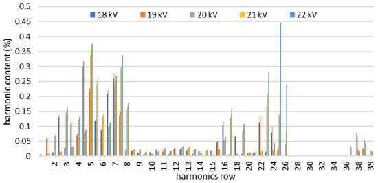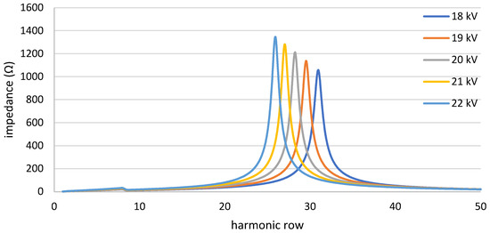 In the case of a nominal voltage—20 kV—the resonance is observed for the 28th harmonic, whereas a reduction in voltage to 18 kV (10%) shifts the resonance to the 31st harmonic. A voltage increase to 22 kV (10%) shifts the resonance to the 26th harmonic. The shift may trigger the resonance of harmonics, which are negligible under normal operating conditions. The resulting voltage harmonics are presented in Figure 9. The harmonics are the result of wind farm inverters with default settings connected to the network, as defined by the impedance characteristics presented in Figure 8. It can be seen that when a harmonic, e.g., 24, is in the resonance band (22 kV), the distortions are increased.