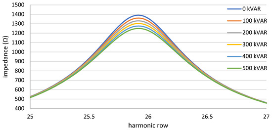 Further, the impact on the capacitor bank is analyzed and presented in Figure 10. As can be seen in the analyzed case, the resonance band is not shifted, but is dampened with the increase in capacitor power. One has to underline that it is also possible that the resonance band will be shifted depending on the power system’s conditions.