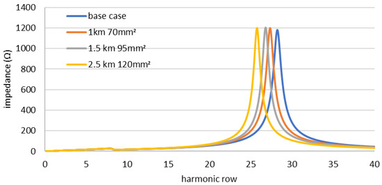 Impedance characteristics of the network as a function of PV plant cable marked in gray in Figure 7.