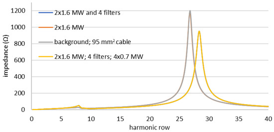 In the next stage, the impact of power plant transformers and the exemplary low-pass filter installed in 750 kW inverters is analyzed [48]. The filter consists of series-connected inductances with L1 = 170 mH, L2 = 80 mH, C = 466 μF, R = 0.1Ω (Figure 12). The gray color shows the impedance characteristics of the network expanded with a 1.5 km 95 mm2 cable line. The orange color shows the network expanded with two 1.6 MVA transformers. The impact of transformers in the analyzed case is negligible, as evidenced by the overlapping characteristics. The impact of transformer capacity is also verified, but no significant impact on the results in the analyzed network is found [49]. The impact of four inverter filters is shown in blue (covered by yellow). Adding filters leads to a clear shift in the resonance band toward higher harmonics, which is usually beneficial, but at the same time, a deterioration in the conditions in the lower harmonics is observed (small resonance band around the eighth harmonic).