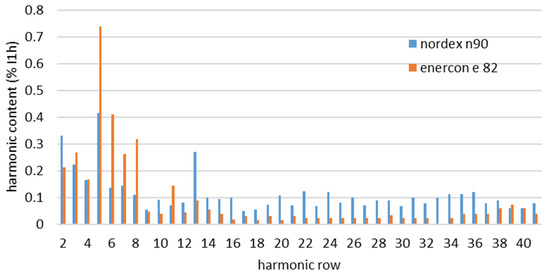 Harmonic spectrum emitted by 2 exemplary wind turbines; based on [51].