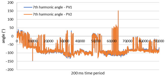 Angles of harmonic shifts of 7th harmonics of two PV power plants located nearby.