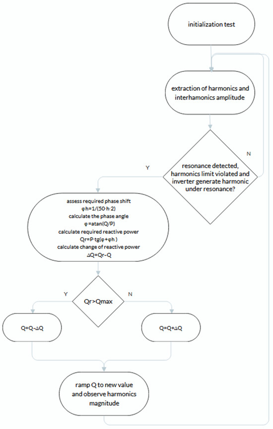 The methodology of using reactive power to mitigate harmonics under resonance conditions is presented in Figure 16. The initiation phase requires on-site measurement, which confirms the proper operation of the presented algorithm for given inverters. After successful verification, the algorithm continuously extracts information about harmonics to detect potential resonance bands. If resonance is detected, the harmonics limit of the harmonics under resonance is violated, the inverter generates resonating harmonics, and the next action is performed. The algorithm assesses the required phase shift (7) or (8) depending on the configuration; further, the phase angle is calculated (or measured) and the required reactive power is calculated based on the sum of the measured angle and required angle change according to (9). Finally, the reactive power change is added to the measured reactive power to obtain a new operating point and the power is changed according to the ramp function, so the best compensation point can be chosen. One needs to note that the detailed phase shift is impossible to calculate because harmonics may consist of different-frequency signals, not just the ideal frequency. Further, it may be required to set an active power threshold above which regulation can be activated because of unstable operation in low harmonics ranges.