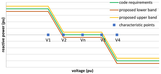 Typical volt VAR regulation characteristics and the proposed exemplary regulation band; where V1—max reactive power generation, V2—start of reactive power generation, Vn—nominal voltage, V3—start of reactive power consumption, and V4—max reactive power consumption.