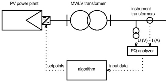 A general diagram of controlled objects is presented in Figure 18. The voltage and current transformer provide signals to the PQ analyzer installed on-site. The PQ analyzer sends signals to the controller, which run the algorithm presented in Figure 16. The presented diagram does not consider PQ measurement on the low-voltage side of the power plant, because the whole operating range should be verified at the commissioning stage. In case one has any doubts, additional PQ measurements are recommended.