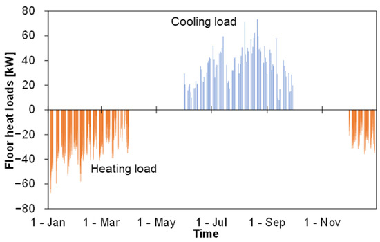 Table 2 shows the specifications of VRF units and GHEs. The total cooling capacity of VRF units was determined based on catalogs [32,33] as 252 kW. A VRF unit with 84.0 kW was used on each floor to supply sufficient amounts of heat even during peak heat loads in the target building. In the GS-VRF and proposed systems, ground-source water was circulated at a rated flow rate of 288 L/min for each VRF unit. The total required number of boreholes was determined as 72 using the following equation by assuming that the ground heat was extracted at qg (=40 W/m) from double U-tube GHEs for the peak heat load qc-peak [34].