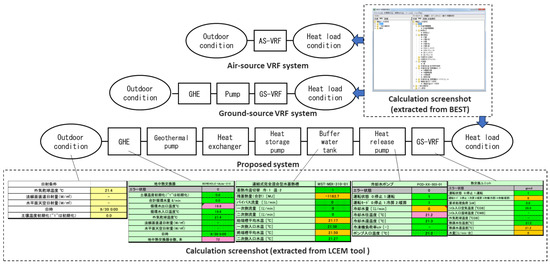 A system simulation model was developed using the Life Cycle Energy Management (LCEM) tool ver. 3.10 distributed by MLIT [31]. In this model, each component, such as GHEs, a buffer water tank, pumps, and VRFs, was connected; component specifications are detailed in Section 4. Hourly heat loads were input to the model to obtain the behavior and energy performance of the proposed system. Three types of models were developed (Figure 4): (1) a general AS-VRF system, (2) a conventional GS-VRF system, and (3) a GS-VRF system with a buffer water tank (hereafter referred to as the proposed system). The cooling and heating seasons were simulated separately from 1 June to 30 September and 1 December to 31 March, respectively.