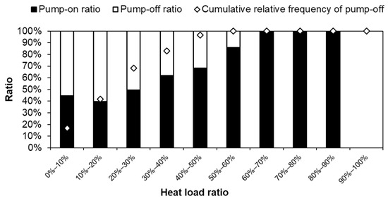 Figure 7 shows the time ratios of pump-on and pump-off statuses obtained from the simulation of the proposed system during air-conditioning hours in every 10%-range of heat load ratios. The pump-off status accounted for more than 50% of the heat load of <30% and decreased with increasing heat load ratio. The cumulative relative frequency of the pump-off time reached 96% in the heat load range of 40–50%. In contrast, the pump-on ratio accounted for the majority of the heat load when it exceeded 50%, indicating that the GHE-side pumps were operated continuously rather than intermittently. These results confirm that the pump control (Figure 6) functioned optimally. Under real-world conditions, intermittent operation may not be achieved at the planned heat load ratios owing to fluctuations of water transfer and temperature conditions within the tank. The simulation result offers reference data for commissioning during the operation phase, where the indices for intermittent control (WTFop and Qop) are adjusted to ensure that the control strategy performs as intended.