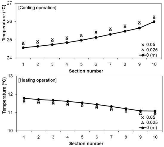 The demand for thermal insulation on the outside and bottom of the buffer water tank was examined, assuming that the tank was installed underground. Figure 8 compares the temperatures of water in each section of the buffer water tank for cases with and without thermal insulation. Foamed polystyrene boards of 25 or 50 mm thickness (λ = 0.034 W/m/K) were assumed for these thermal insulation simulations. Cooling and heating temperatures for the case without thermal insulation were 0.29 °C lower and 0.17 °C higher, respectively, than those for the case with 50 mm-thick thermal insulation. This implies that without insulation, heat is transferred between the ground and buffer water tank, and the water temperature is recovered to near its initial temperature. The water temperature varies based on the exhaust heat from the VRF systems. Therefore, a buffer water tank without insulation would be beneficial for the proposed system, unlike conventional water storage systems that require thermal insulation to store chilled or warm water with large temperature differences from the ground. This would be beneficial from a practical point of view. It should be noted that in the long term, severe imbalances between cooling and heating could lead to a decline in system performance, similar to conventional GSHP. Thus, determining appropriate capacities for the GHE and buffer water tank through annual simulations during the design phase is essential.