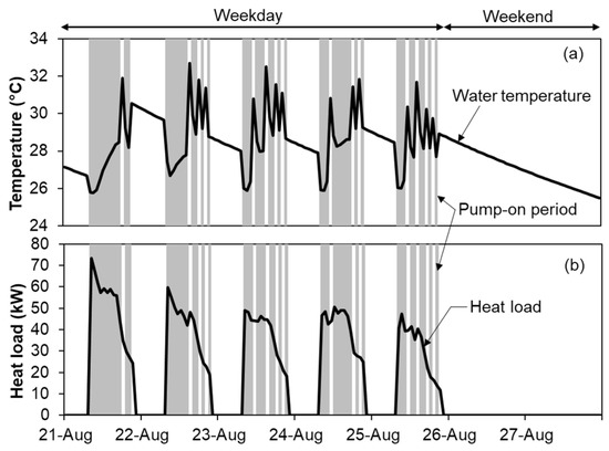 Figure 9 shows the variations in the average temperature of water in the buffer water tank and heat loads, including the peak cooling load, during a representative week for the case without thermal insulation. Continuous pump-on operation was observed during the periods with relatively large heat loads, particularly on 21 August, when the load reached its peak. Pump-on and pump-off periods occurred alternately as the heat load decreased in the afternoon, indicating the successful functioning of intermittent control. The water temperature increased above 30 °C during pump-off periods and decreased by 3 °C–4 °C during pump-on periods. The water temperature decreased by approximately 3.5 °C during the weekend when no heat loads occurred, suggesting that heat from the water in the uninsulated buffer water tank was transferred to the ground. These results indicate that intermittent control partially reduced the pump operation hours even in midsummer, and the water temperature was maintained below 32 °C. Thus, the proposed system design and intermittent control exhibited optimal performance.