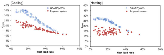 The efficiency of ground-source water transfer was evaluated using εpump and WTF. Figure 10 shows the relation between heat load ratios and εpump based on integrated values per day for the conventional GS-VRF system and the proposed system. εpump of the proposed system reduced more at every heat load ratio than that of the GS-VRF system. The GS-VRF system showed large εpump of ~35% and 27%, respectively, during cooling and heating; however, at low load ratios below 20%, the proposed system restrained the high εpump at low loads. This indicates that relatively little energy was consumed while transferring ground-source water. The main reason for this would be that the proposed system, with intermittent control, operates at appropriate flow rates even under low load ratios, compared with conventional GS-VRF systems. The seasonal average of εpump for the proposed system was 18% during cooling and 14% during heating, possibly due to the partial load efficiencies of VRF systems between the two seasons. VRF systems generally operate at higher load ratios during cooling than heating, resulting in higher energy efficiencies. This led to relatively large ratios of the pumping power to the total energy consumption during the cooling season.