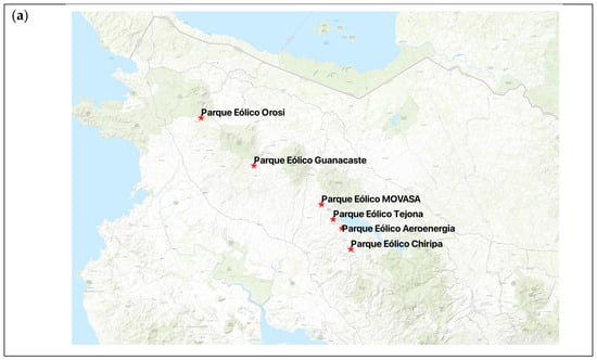 Regions with complex topography present significant challenges for numerical weather prediction, and Central America exemplifies this complexity. Costa Rica, for instance, is in one of the narrowest parts of Central America, with a width ranging from approximately 150 to 250 km. The wind farms in Costa Rica are situated to the west of the rugged mountain ranges that traverse the country from northwest to southeast, specifically the “Cordilleras de Guanacaste and Talamanca”, which are flanked by coastal plains. The location of the wind farms in Costa Rica can be seen in Figure 1a.