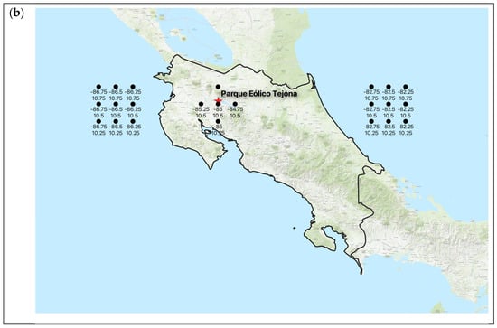 (a) Location of wind farms in Costa Rica; (b) location of grid points of GFS used. “Parque Eólico Tejona” is the name of the wind farm used here.