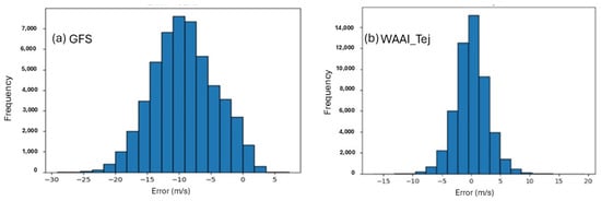 Error distribution in wind speed prediction of the GFS model (a) and the WAAI_Tej (b).
