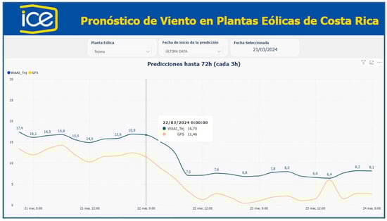 The WAAI_Tej has been integrated into the ICE server and is automatically executed once a day. The implementation was carried out in Python 3.8 and coordinated using the Scheduler library (version 1.2.1). This is the Python library that manages the whole process to ensure periodic and automatic execution of the model. The data generated by WAAI_Tej is stored in a local PostgreSQL database, ensuring its availability and easy access for further analysis. Additionally, a visualization dashboard has been developed in a Business Intelligence (BI) tool (https://www.microsoft.com/pt-br/power-platform/products/power-bi/, accessed on 31 July 2024), which directly consumes the data stored in the database, allowing users to easily access and interpret the forecasts generated by the model. This integration provides a comprehensive and efficient solution for wind forecasting and visualization for Tejona. Figure 3 shows an example of the output for a forecast generated on 2 February 2024. The GFS and WAAI_Tej forecasts are plotted together for comparison. It may be noted that the result is more than a simple bias correction, having variable corrections for different times. This is a result of the AutoML capturing different large-scale atmospheric patterns in the GFS output and producing the optimized correction.