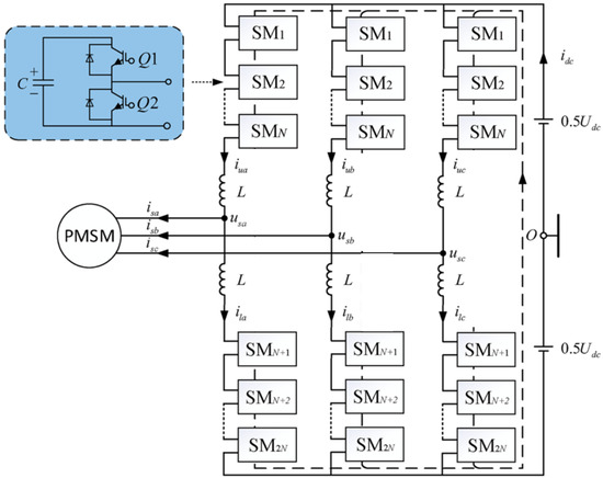 MMCs are a type of voltage source converter that is currently used to address high power and high voltage applications. An MMC consists of many submodules (SMs) connected in series to create an arm [9]. In this study, the MMC operates in a three-phase configuration with a power rating of up to 500 W, suitable for medium-voltage motor drive applications. Regarding its structure, each submodule usually comprises a capacitor and two semiconductor switches that can either be connected in parallel or in series to regulate the voltage. The basic structure of an MMC, as shown in Figure 1, has more submodules in an arm, and each arm is separated by upper and lower segments. These arms join up to form a phase leg, and several phase legs make up the complete converter. The MMC operates under various modes, including normal operation, fault-tolerant operation, and dynamic response to load changes. The technological cycle involves sequential switching of submodules to synthesize the desired output voltage waveform, achieving high-quality voltage with low harmonic distortion. The converter’s switching frequency and modulation strategies are designed to optimize performance and efficiency. The basic building blocks of an MMC are submodules where each submodule has a capacitor and two switches through which the MMC can be connected in the circuit or removed from it [10]. The level of voltage output of the arm is identified by the presence or absence of one or many submodules. There is an upper and lower arm in every phase of the MMC, and each of these arms consists of several submodules connected in series. Figure 1 demonstrates that there are inductors located in each arm used to limit current during transients and control the power sharing between submodules. The fact that these MMCs are modular has some benefits, such as scalability, fault tolerance, and the ability to synthesize high-quality voltage waveform with low harmonic distortion. This makes MMCs particularly suitable for applications where the control of power quality is very important. Adding more submodules to the converter increases the voltage level without affecting the control complexity severely. This modular design also makes it easier to implement maintenance [11] and fault management since each submodule that needs servicing or replacement can be performed without affecting the entire system. Moreover, due to their excellent efficiency and low total harmonic distortion, MMCs are suitable for applications that need high power quality.