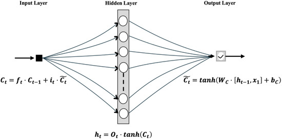 Recurrent neural networks (RNNs) are a specialized type of artificial neural network designed to handle sequential and time-dependent data [18]. Unlike traditional feed-forward neural networks, which assume that all inputs are independent of each other, RNNs introduce layers within their network architecture; as Figure 3 shows, the layers network architecture of RNN in which is the cell state at time t, acting as the memory that carries crucial information across time steps. is the forget gate, which decides what information from the previous cell state should be discarded. is the hidden state at time t, representing the output of the LSTM unit that combines current input with past context and is passed to the next time step. is the output gate, controlling how much of the cell state’s information is exposed to the hidden state. Together, these components regulate the flow of information, enabling the LSTM unit to capture long-term dependencies in sequential data effectively. This recurrent structure allows them to maintain a hidden state that captures information about previous inputs, effectively giving the network a form of memory. At each time step, an RNN takes in the current input along with the hidden state from the previous time step to produce an output and update the hidden state. This architecture enables RNNs to capture temporal dependencies and patterns over sequences of data [19], making them particularly effective for tasks where the context provided by previous elements in the sequence influences the current output. Examples include language modeling, speech recognition, and time-series forecasting. In the context of MMCs, the system’s electrical parameters, such as voltage and current, exhibit temporal dependencies due to the switching actions, load variations, and dynamic responses inherent in power electronic converters. Standard feed-forward neural networks are inadequate for capturing these temporal patterns, whereas RNNs can maintain a hidden state that reflects the history of previous inputs, effectively giving the network a form of memory. However, standard RNNs suffer from issues like vanishing gradients when dealing with long sequences, limiting their ability to capture long-term dependencies. To overcome this, we utilize long short-term memory (LSTM) networks, a special kind of RNN that introduces memory cells and gating mechanisms to effectively capture both short-term and long-term dependencies in the data. The choice of LSTM networks is justified by their ability to model the temporal dynamics of MMCs accurately. By learning from historical voltage and current data, the LSTM network can generalize patterns and predict capacitance values under varying operating conditions, addressing the limitations of traditional methods. This makes LSTM networks particularly suitable for real-time capacitance estimation in MMCs, enhancing the system’s adaptability and performance.