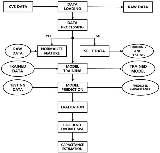 The mean squared error (MSE) analysis is a crucial metric for evaluating the performance of the discussed LSTM model. It measures the average squared difference between the predicted capacitance values and the actual values. A lower MSE indicates that the model’s predictions are closer to the actual capacitance values, signifying better performance. During the evaluation phase, we calculate the MSE for both the training and test sets. This helps us understand how well the model has learned the underlying patterns in the data and whether it can generalize to new, unseen data. We calculate MSE for the training set using Equation (4), where N is the total number of observations, represents the actual capacitance values, and are the values predicted by the model. Monitoring can be performed to see how well the model is learning. A decreasing MSE during training indicates that the model is improving. By also calculating MSE for the validation and test sets, it can check for overfitting. If the MSE on the test set is much higher than on the training set, the model might not generalize well to new data. This evaluation helps us fine-tune the model’s hyperparameters, such as the number of LSTM layers, units per layer, learning rate, and batch size, to achieve optimal performance, which is all depicted in Figure 5 below.