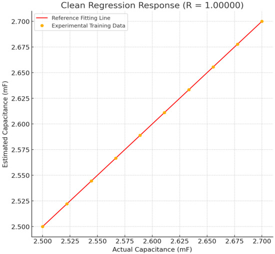 The regression response of the LSTM model refers to how well the model can predict the continuous output values (capacitance) based on the input sequences (voltage and current readings), as depicted in Figure 6. To analyze the regression response, plot the predicted capacitance values against the actual values. A plot where the predicted values closely follow the actual values indicates a strong regression response, suggesting that the model captures the underlying relationship between the input and output variables effectively. The residuals, which are the differences between the predicted and actual values, are also examined.