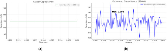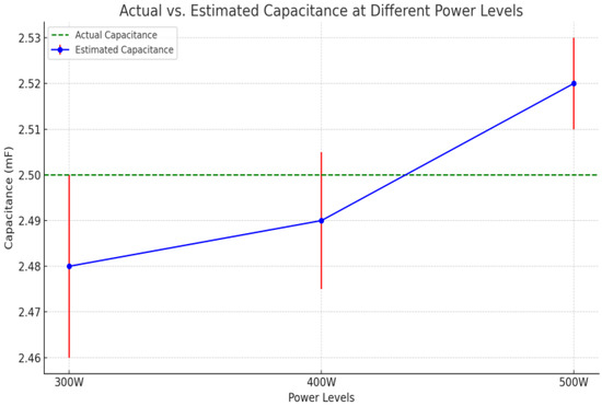 Figure 9 shows the actual versus estimated capacitance values at different power levels: 300 W, 400 W, and 500 W. The results demonstrate the high accuracy and reliability of the proposed LSTM-based method.