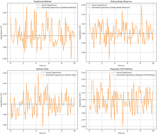 By contrast, the proposed LSTM-based method leverages the power of machine learning to provide real-time, accurate estimates of capacitance, adapting to dynamic changes in the system. Table 2 and Figure 11 summarize the performance metrics of the different techniques.