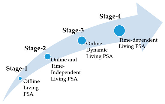 In 2020, Chen proposed a four-stage Living PSA characterized by automatic model updating. It was a time-dependent Living PSA that combined online nuclear power plant (NPP) status monitoring and predictive technologies with automatic signal updates and online data analysis and recovery [25,26].