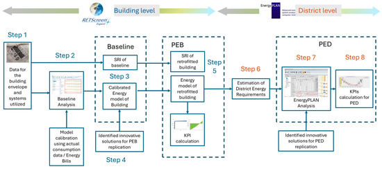 Flow chart of methodology for energy analysis at both the building and district levels.