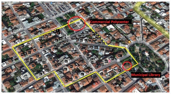 The selected PED area is in the city center and comprises 105 mixed-use privately owned (non-municipal) buildings, including residential and non-residential structures, as well as two municipal buildings: the Commercial Polycenter and the Municipal Library. An in situ inspection assessed the key characteristics of the non-residential building, including usage, useful area, number of floors, geometry, and age, to determine the energy requirements of the neighborhood in its baseline condition prior to any renovation measures examined.