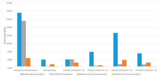 The analysis to estimate the energy requirements of each building, including space heating (district heating demand), electricity for cooling, lighting, appliances, and district heating demand for domestic hot water (DHW), was conducted using RETScreen following the methodology outlined in Section 2. The results are presented in Table 4 in terms of specific heat (kWh/m2) and were subsequently multiplied by the total area of the buildings in each group to calculate the total consumption for the 88 residential buildings (Table 5).