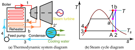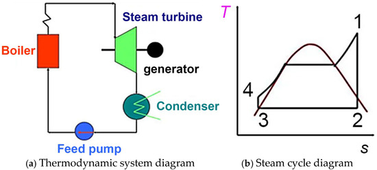 Figure 2 is a schematic diagram of the thermodynamic cycle of a high-pressure unit. It can be seen that the water is compressed and pressurized by the feed pump, it is heated into superheated steam in the boiler, and then it enters the steam turbine to expand and do work. After the work, the low-pressure steam enters the condenser to be cooled and condensed into water, and then returns to the pump to complete a cycle. As can be seen in Table 1, for high-pressure units, the saturation pressure of water is relatively low, so the finished exhaust gas still has a high dryness, which can make the turbine operate safely. Therefore, the a reheat cycle is not used for units below 50 MW class [35,36].