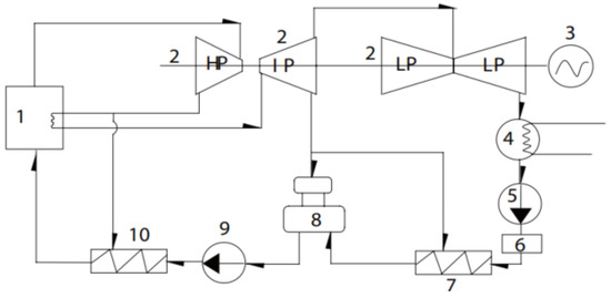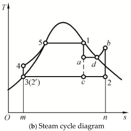 According to Rankine cycle law, increasing steam initial parameters of steam can improve the cycle thermal efficiency. Figure 3 is a schematic diagram of the thermodynamic cycle of the coal-fired units with ultra-high pressure and above steam parameters. Due to the constraints of the material technology development at that time, it was difficult to improve the steam parameters, so the method of increasing to ultra-high pressure was adopted to improve the cycle thermal efficiency. The higher pressure reduces the dryness of the steam and increases the wet steam content, and the steam needs to be reheated to ensure the safety of the turbine and avoid the occurrence of water corrosion. Therefore, for units above the ultra-high-pressure level, that is, units above the 135 MW level, in order to improve the steam dryness at the last stage of the steam turbine and the thermal efficiency of the unit, the reheat cycle is adopted [37,38]. At the same time, by properly designing steam parameters, the thermal efficiency of the unit is also improved.