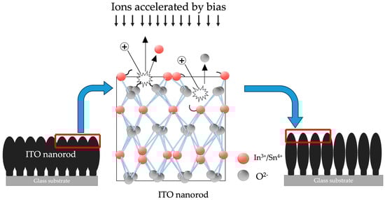 Processing of oxygen plasma bombardment to the ITO−nanorod surfaces driving under bias−magnetron RF sputtering method with different gas conditions of 20, 40, 60, 80, and 100 sccm.