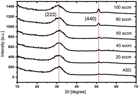 Figure 4 illustrates the X-ray diffraction patterns of ITO film before oxygen plasma treatment (As-deposited: ASD) and after oxygen plasma treatment at a flow rate of 20, 60, 80, and 100 sccm as can be seen in the figure; the X-ray diffraction patterns of the ITO surface show diffraction planes at (222) and (440) with 2 of 30.7 and 51.3, respectively.