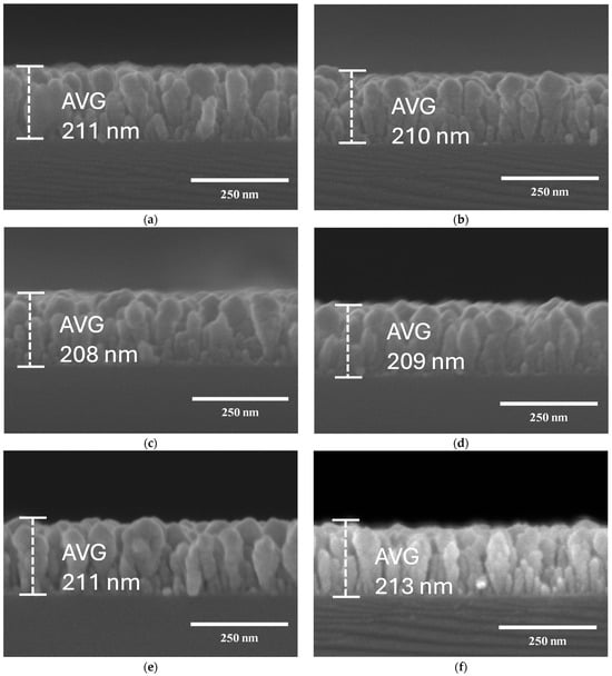 Cross-section images of FE-SEM analysis on ITO-nanorod deposited on glass substrate treated with oxygen plasma of varying gas flow rates compared with ASD film: (a) ASD; (b) 20 sccm; (c) 40 sccm; (d) 60 sccm; (e) 80 sccm; (f) 100 sccm.